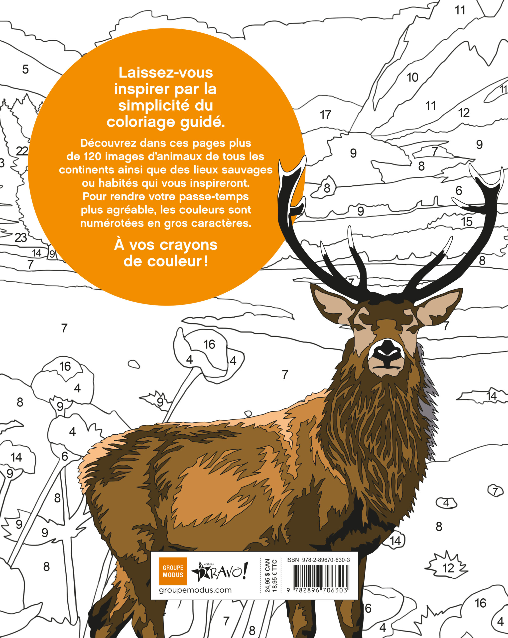 Découvrez dans ces pages plus de 120 images d'animaux de tous les continents ainsi que des lieux sauvages ou habités qui vous inspireront. Pour rendre votre passe-temps plus agréable, les couleurs sont numérotées en gros caractères.