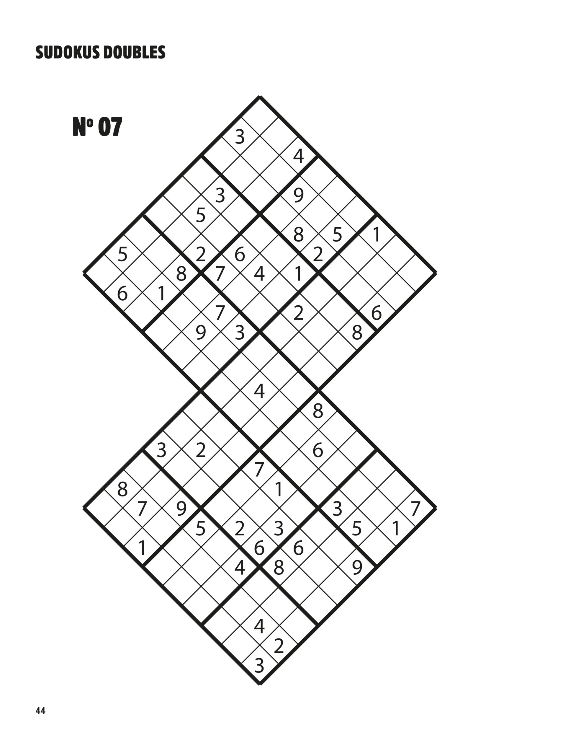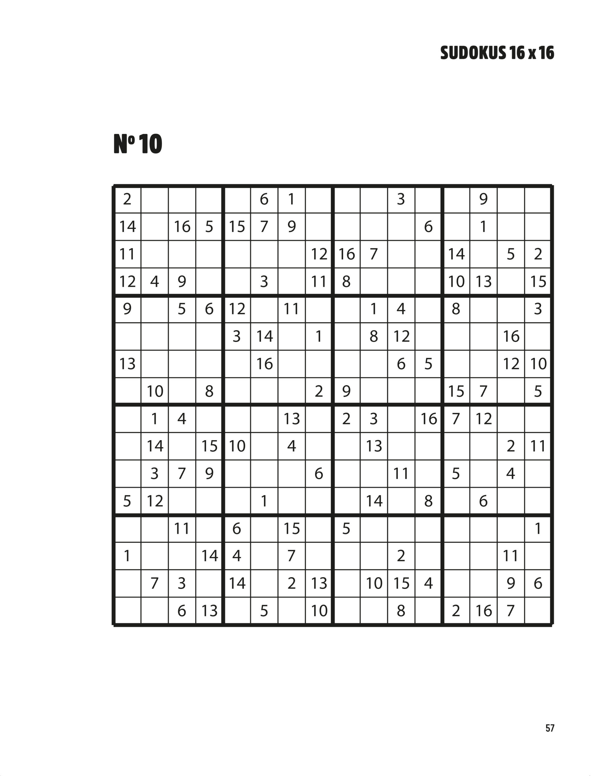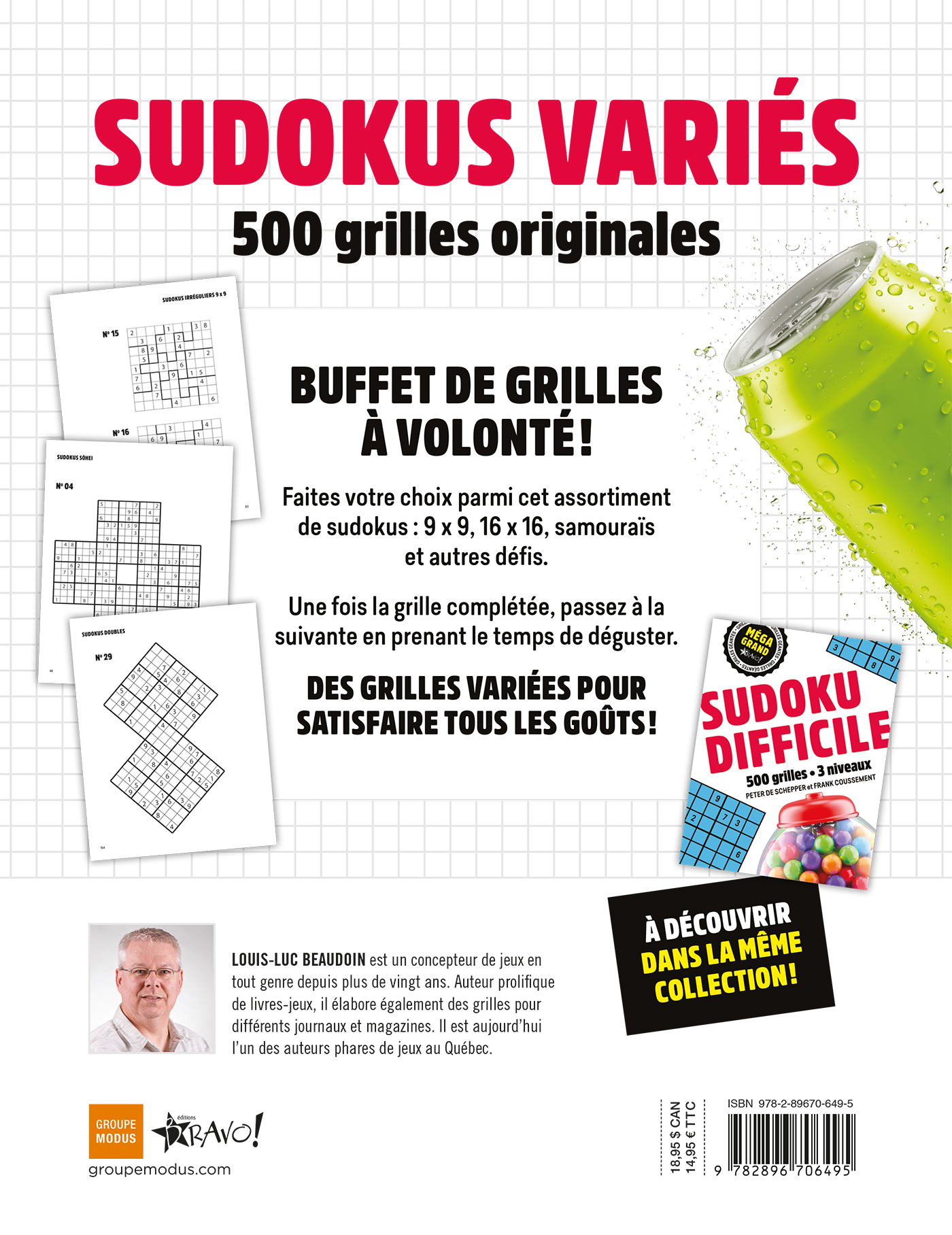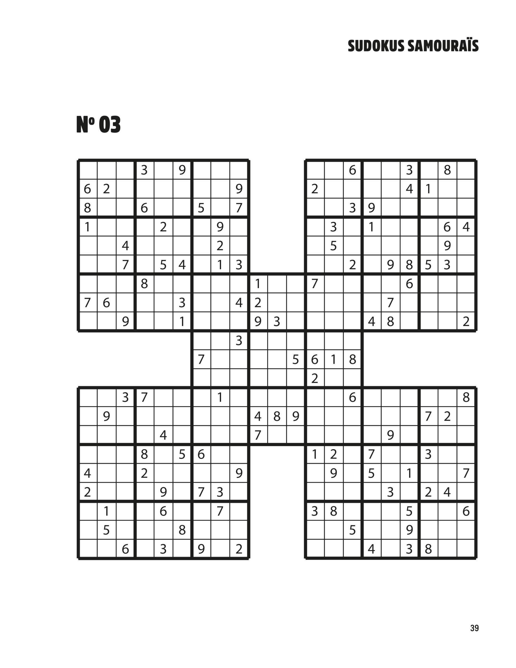 Dans Méga grand - Sudokus variés, découvrez des grilles sudokus de toutes les tailles (7x7, 8x8 et 9x9 et 16x16) et de toutes les formes (irrégulier, double, sōhei et samouraï). Avec plus de 500 grilles de sudokus variés, il y en a pour satisfaire tous les goûts!