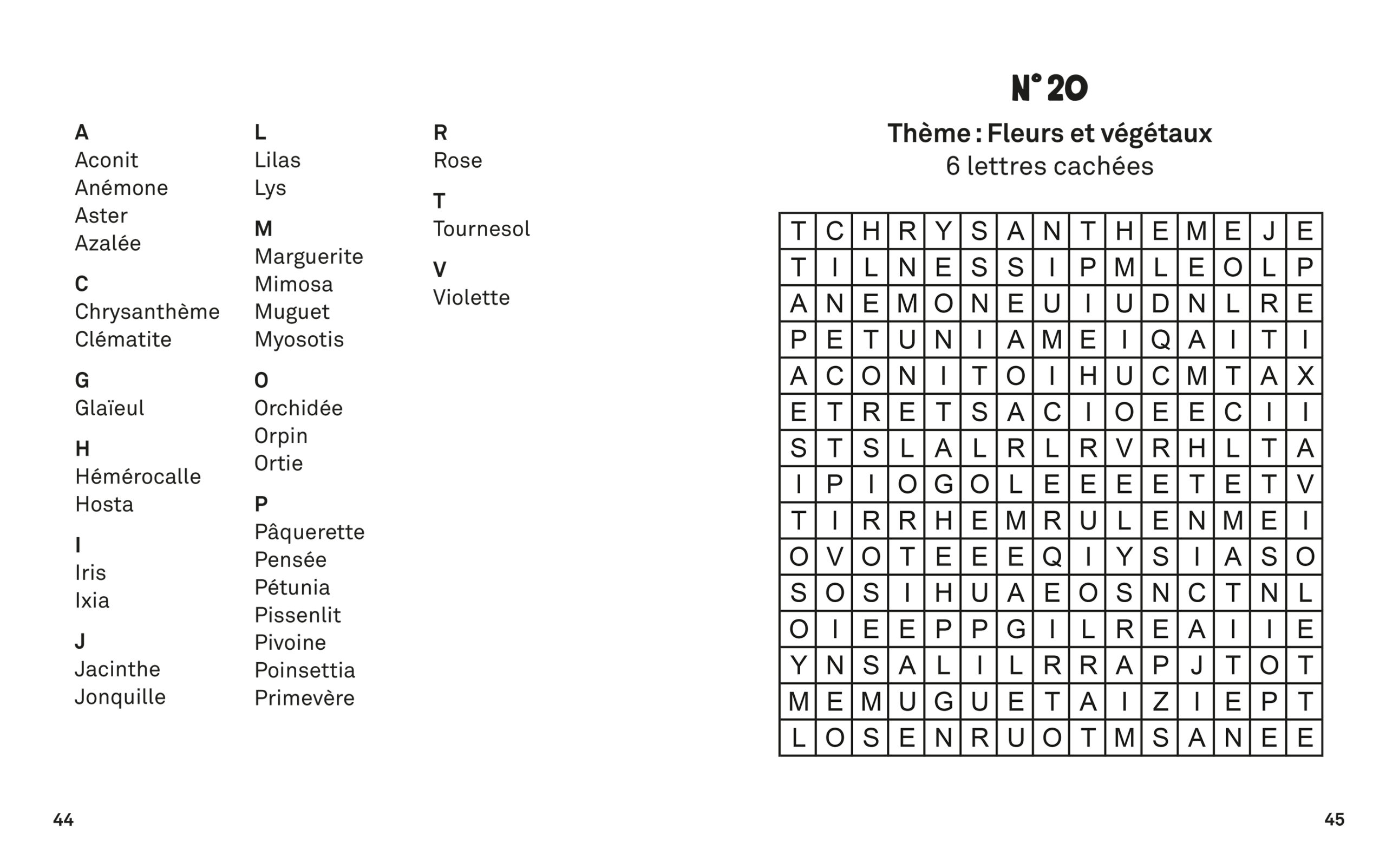 Voici un nouveau livre-jeu de mots cachés, le jeu de lettres préféré des Québécois. Découvrez 90 grilles de mots cachés thématiques, de format 15 x 15.  Fouillez dans la grille pour trouver les mots pêle-mêle et trouvez la solution !